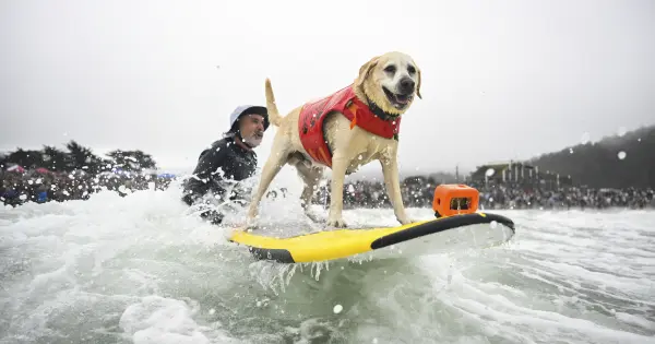 Labradores, terriers y spaniels con chalecos salvavidas marcados con monogramas nadaron hacia el Pacífico. Una vez en las olas, sus dueños los ayudaron a subirse a las coloridas tablas y a sostenerse en ellas mientras la multitud los vitoreaba desde la playa.