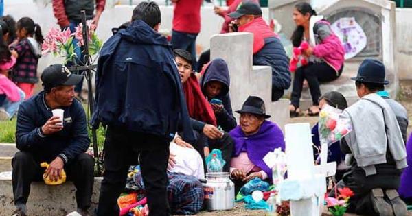 En familia, rezan y conversan como si los muertos estuvieran presentes y esperan consejos de ellos. Sobre las tumbas extienden grandes manteles donde colocan el cucayo (comida).