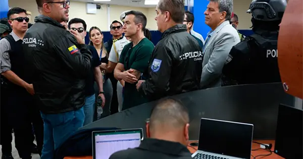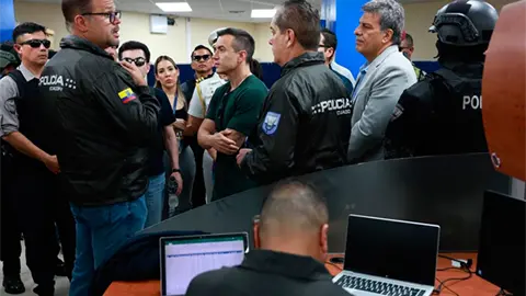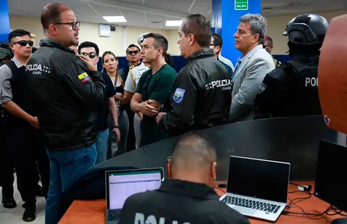 En imágenes difundidas por el Ministerio del Interior se observa al presidente Daniel Noboa ingresando a la empresa eléctrica de Guayaquil junto a Reimberg y personal de seguridad en medio de la operación en contra de la presunta red de corrupción.