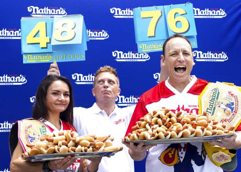 El concurso de Nathan's, el fabricante más popular de "hot dogs" de Nueva York, se celebra cada Día de la Independencia de EE.UU. en el enclave playero de Coney Island y es la más conocida de las competiciones de tragar comida a gran velocidad que se organizan a lo largo del país.