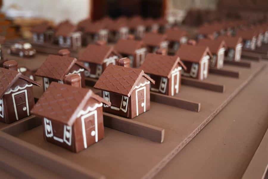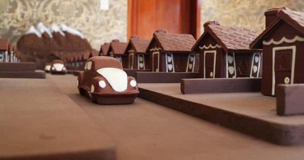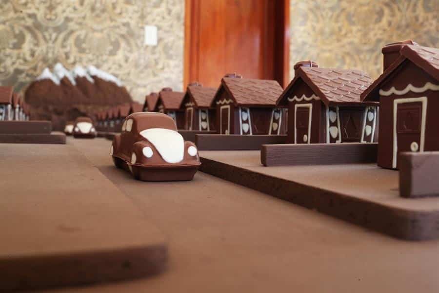 El "plato fuerte" de la muestra es la "Ciudad Cacao", una maqueta de casi cuatro metros cuadrados que representa una pequeña ciudad de chocolate con 36 casas, dos carruseles, una iglesia, 25 árboles y 2 casetas de seguridad, detalló Gerl.