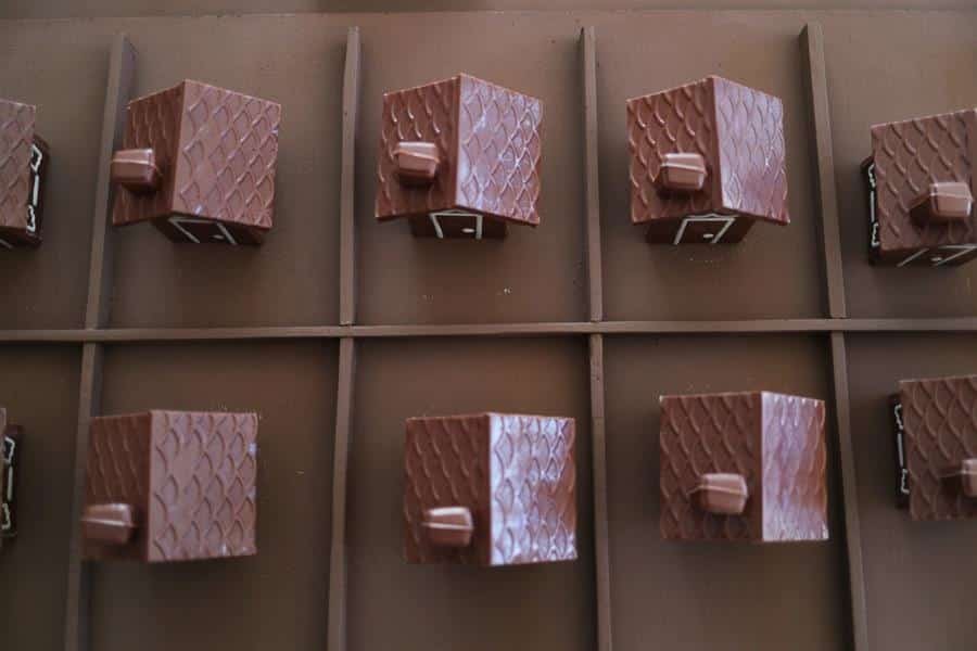 También hay un cuadro que explica el proceso para transformar el cacao en chocolate y pequeños impresos con curiosidades sobre el consumo del producto a través de la historia.