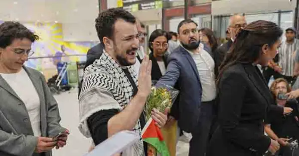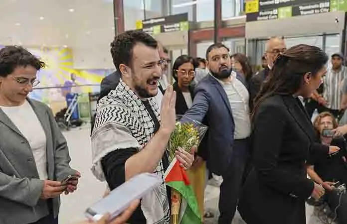 Concord, Nueva Hampshire.- Un activista palestino que estuvo detenido durante más de tres meses empujaba el cochecito de su pequeño hijo con una mano y levantaba el puño en el aire con la otra mientras sus seguidores le daban la bienvenida a casa el sábado.