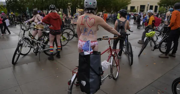 Paseo en bicicleta desnudo destaca en protesta en Portland
