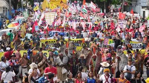 Belém, Brasil.- Algunas personas vestían de negro el sábado, representando un funeral por los combustibles fósiles. Cientos llevaban camisetas rojas, que simbolizan la sangre de colegas que luchan por proteger el medio ambiente. Y otros coreaban, ondeaban enormes banderas o sostenían carteles en el que tradicionalmente es el mayor día de protestas en el punto medio de las conversaciones anuales sobre el clima de las Naciones Unidas.