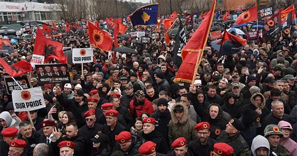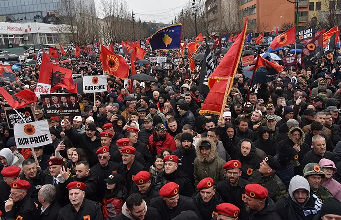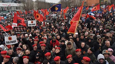 Los manifestantes, muchos envueltos en banderas albanesas rojas y negras, desafiaron el clima frío y nevado en la capital, Pristina, para expresar su oposición a los procesos en La Haya contra el expresidente y líder rebelde Hashim Thaci y otros tres acusados de atrocidades durante y después del conflicto que dejó unos 13.000 muertos.