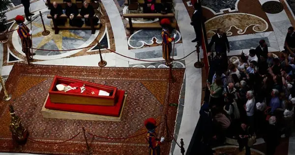 Multitudes de fieles avanzaron lentamente hacia el altar principal de la basílica del siglo XVI, donde el sencillo ataúd de madera de Francisco estaba colocado en una rampa inclinada, mientras cuatro guardias suizos permanecían firmes. En los próximos días se espera que decenas de miles de personas pasen por la basílica, y el Vaticano anunció que podría dejarla abierta después de la medianoche debido a la gran cantidad de fieles. En las primeras ocho horas y media, 19,430 personas rindieron un último adiós al papa.