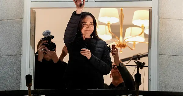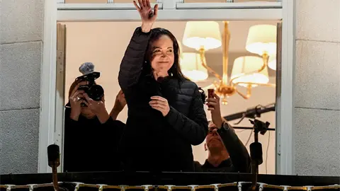 Vestida con jeans y una chaqueta acolchada, Machado pasó varios minutos fuera del hotel, donde se unió a algunos miembros de su familia y varios de sus colaboradores más cercanos. Abrazó a muchas de las personas en la multitud en medio de cánticos de "¡Presidenta! ¡Presidenta!".