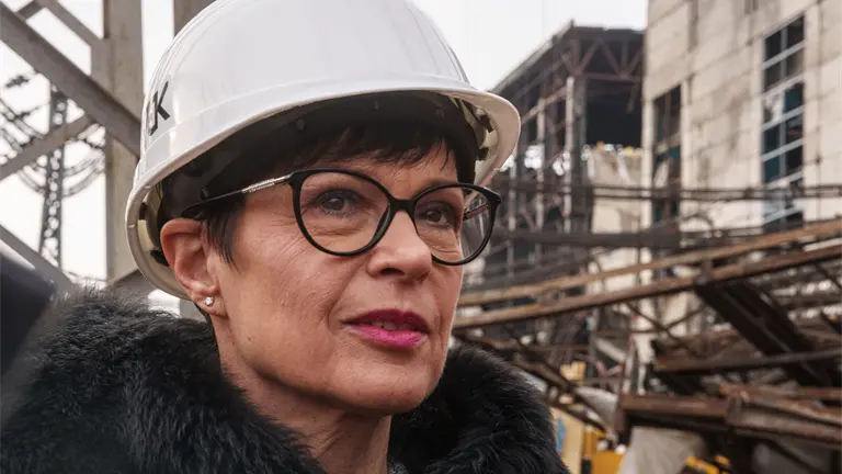 La diplomática eslovena recorrió la planta de energía gravemente dañada, donde la maquinaria pesada estaba ennegrecida, los paneles de control derretidos y un enorme agujero se abría en el techo de uno de los edificios principales.