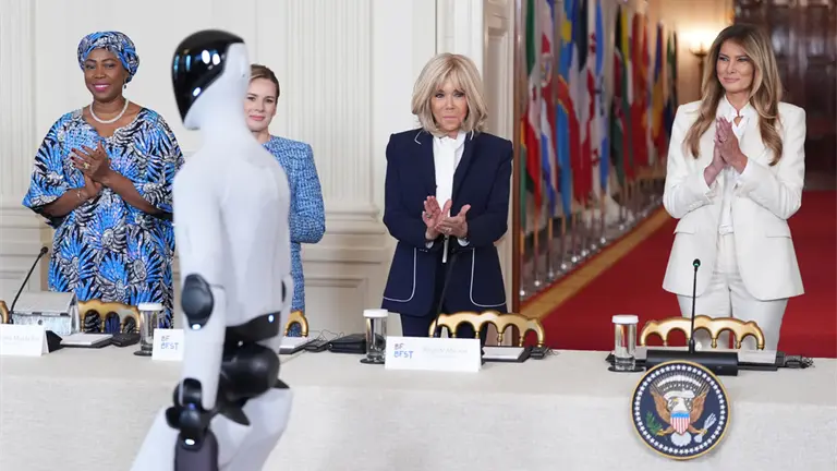 Melania Trump y el humanoide caminaron lentamente, uno al lado del otro, por la alfombra roja desde el extremo opuesto del pasillo. La primera dama se detuvo justo antes de entrar al Salón Este, mientras el robot rodeaba la mesa con los panelistas y se colocaba en el centro de la sala.