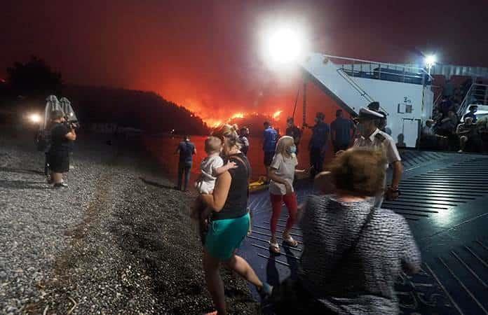 En la isla griega de Eubea, los guardacostas organizaron una operación a gran escala para evacuar a cientos de personas por mar, utilizando lanchas patrulleras y embarcaciones pesqueras y privadas para rescatar a los residentes y veraneantes de las llamas durante la noche y el viernes. Otras decenas de pueblos y barrios fueron desalojados en el sur del Peloponeso y al norte de la capital griega, mientras las llamas avanzaban por los bosques de pinos.