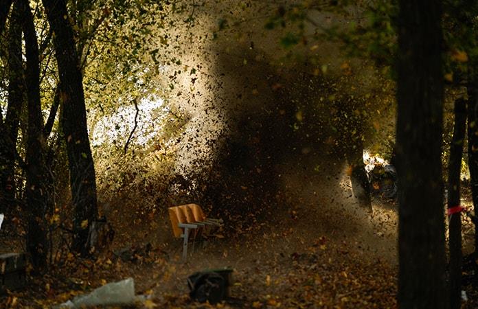 Cuando se detonó la carga,algo a lo que los soldados se refirieron entre risas como “bada-boom”, la enorme explosión rasgó el aire haciendo que una cascada de hojas otoñales cayese desde los árboles cercanos y provocando una alta columna de humo gris.