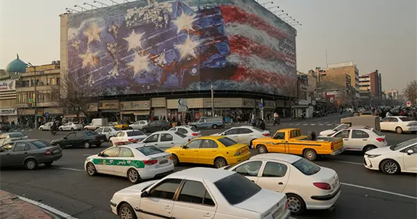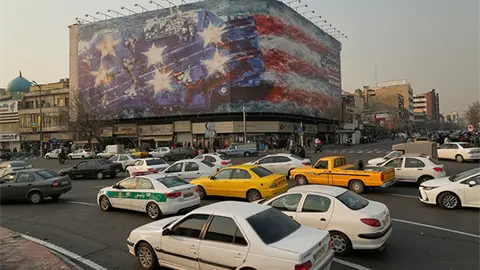En la Plaza de Enghelab (Revolución), en el centro de la capital iraní, se instaló el mural con la imagen del portaaviones estadounidense pintado con los colores de la bandera de ese país y atacado por Irán.