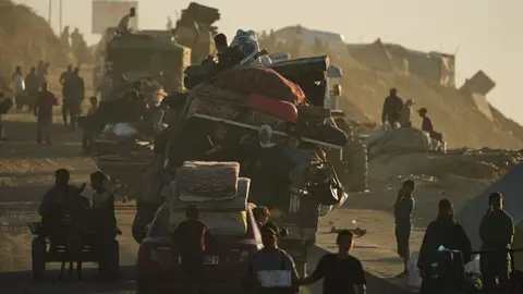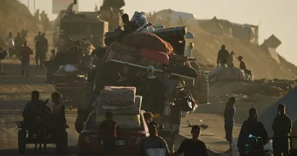 La carretera hacia el sur estaba llena de palestinos que huían. Camiones y coches que habían sido cargados apresuradamente circulaban junto a personas a pie que cargaban sus pertenencias.