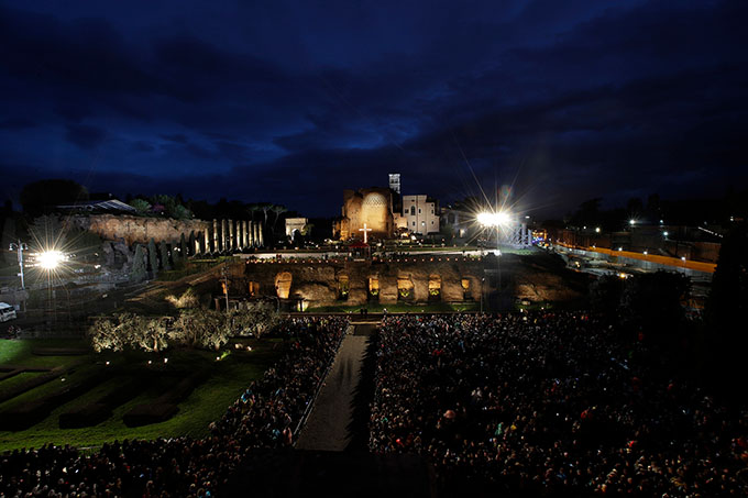 Aproximadamente a las 21:15 horas locales (20:15 GMT), el pontífice dio inicio al recorrido de la cruz, que comenzó su procesión dentro del antiguo anfiteatro romano mientras él siguió la ceremonia desde el vecino Monte Palatino.
