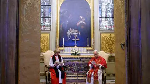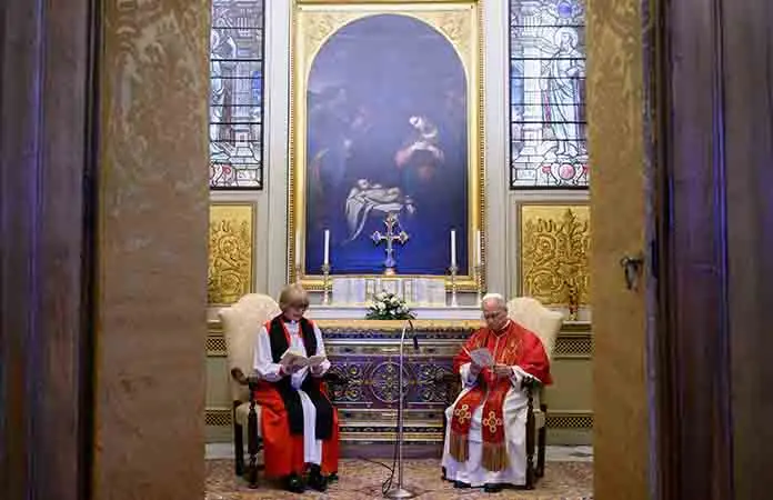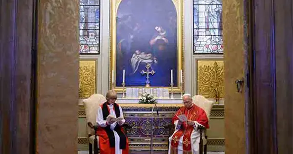 Tras reunirse en la biblioteca de León XIV, ambos oraron juntos en la capilla de Urbano VIII dentro del palacio Apostólico para lo que, según el Vaticano, fue un "momento de oración". La oficina de Mullally dijo que León presidió, pero que ambos "dijeron la gracia juntos".