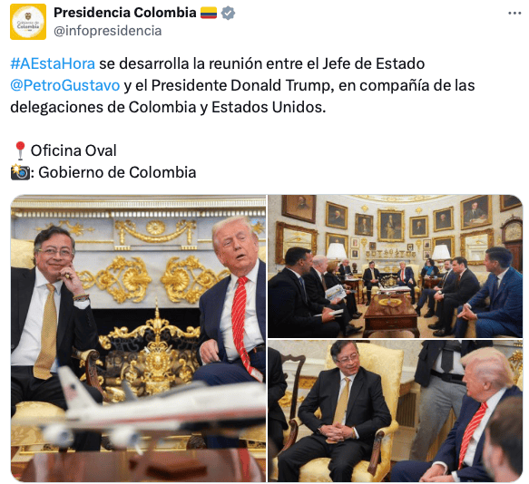 La Presidencia de Colombia difundió una imagen del encuentro a través de su cuenta oficial en la red social X, en la que se observa a ambos mandatarios dialogando en una sala del recinto presidencial estadounidense.
