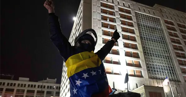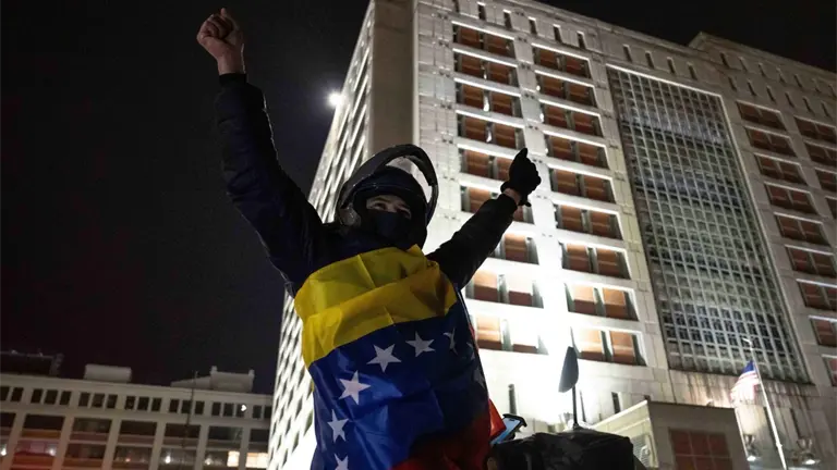 Una multitud de expatriados venezolanos, muchos envueltos en banderas, se reunió en las aceras fuera de la cárcel el sábado por la noche para celebrar la captura de Maduro. La multitud vitoreó cuando llegó al lugar la caravana policial que se creía transportaba al líder depuesto y a su esposa.