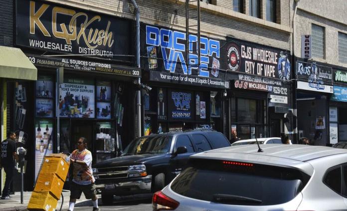 A escasa distancia de los cuarteles de la policía de Los Ángeles, una serie de negocios venden abiertamente envases y otros materiales necesarios para fabricar los vapeadores de marihuana falsos que han invadido el mercado de cannabis de California.