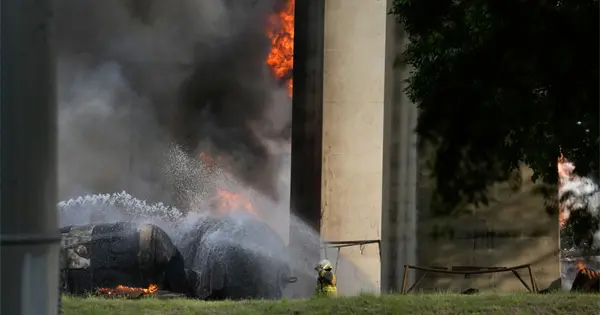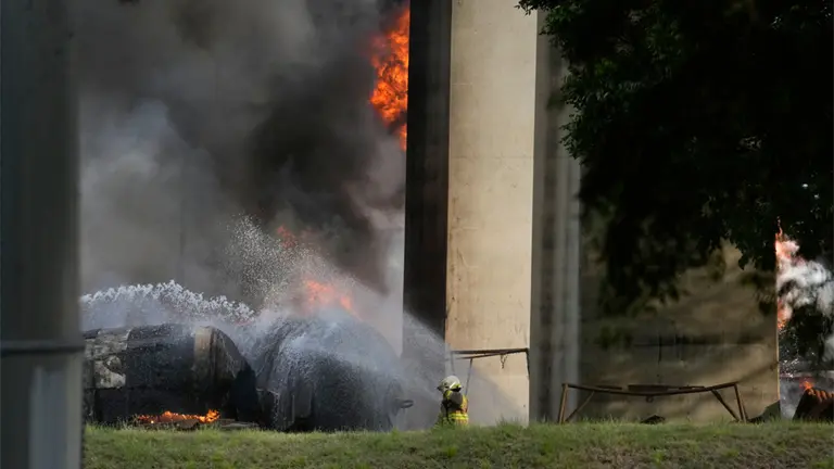 Una explosión de camiones cisterna causó un incendio que afectó el puente Américas y dejó un fallecido y dos bomberos con quemaduras.