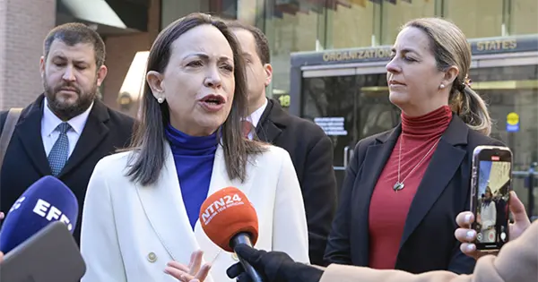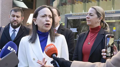 "Vemos esta reacción de la tiranía, donde por una parte, inmediatamente vuelven a detener, a secuestrar a mi amigo, mi compañero, Juan Pablo Guanipa", dijo Machado tras haber comparecido ante la Comisión Interamericana de Derechos Humanos en Washington.
