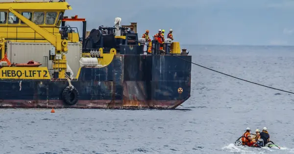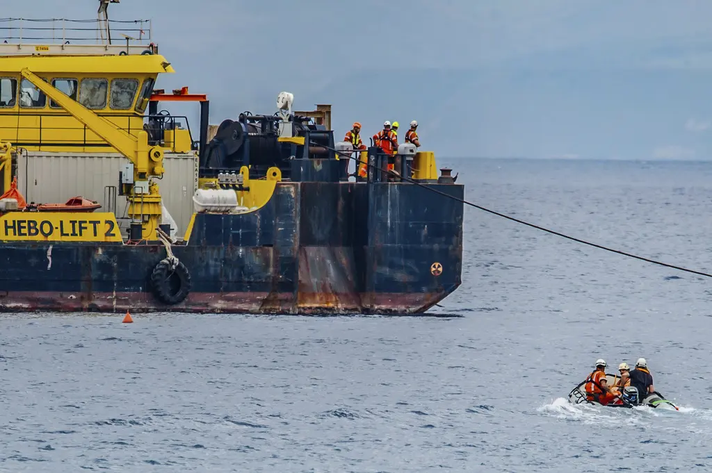 Los expertos en salvamento marítimo comenzaron a trabajar a principios de mayo para reflotar el barco frente al puerto siciliano de Porticello, usando una de las grúas marítimas más poderosas de Europa.