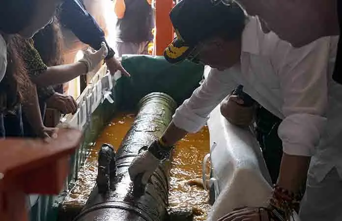 La operación se llevó a cabo entre los pasados 16 y 18 de noviembre y entre los objetos extraídos del San José, que fue construido en 1698 en Guipúzcoa (España), está un cañón en el que, en las fotografías divulgadas por la Presidencia colombiana, se alcanza a leer la palabra “Sevilla”, ciudad en la que funcionó desde 1565 la Real Fábrica de Artillería.