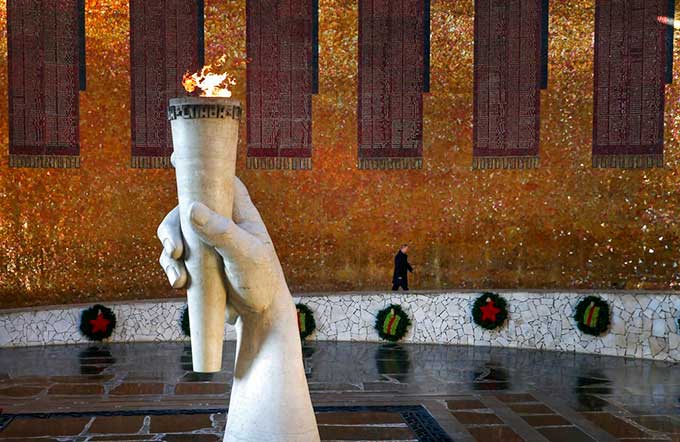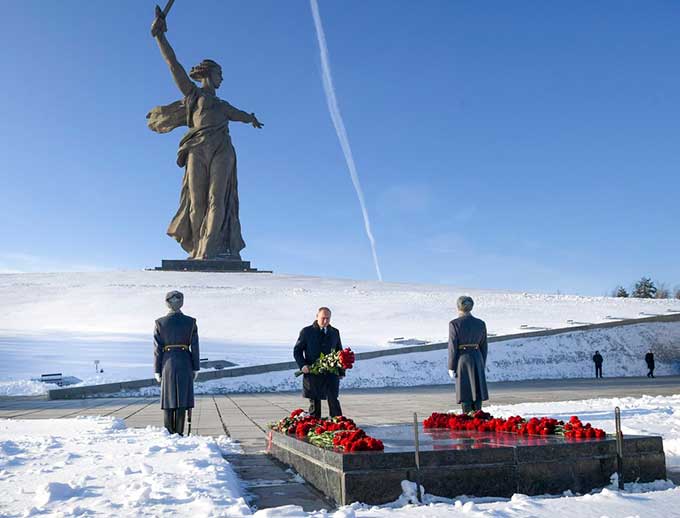 Putin se desplazó a Volgogrado, actual Stalingrado, para hacer una ofrenda floral en la Sala de la Gloria Militar del memorial de Mamáev Kurgán, una colina que está presidida por una gigantesca estatua de la Madre Patria.