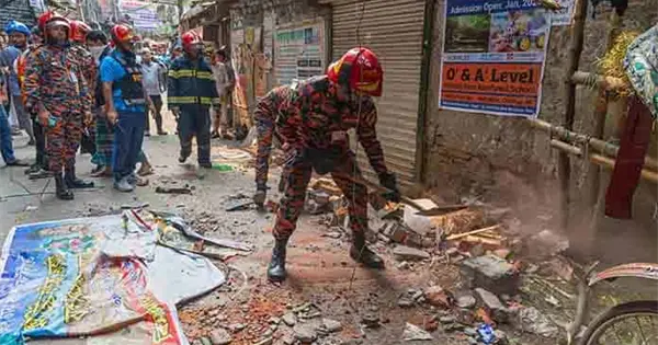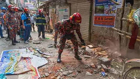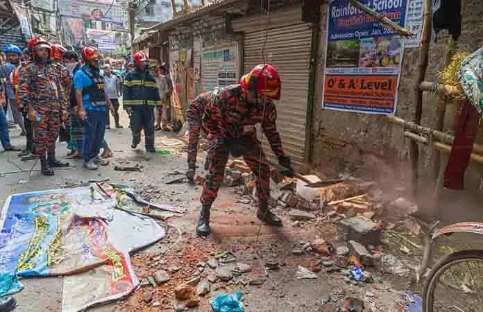 El Departamento de Bomberos y Defensa Civil desplegó a los bomberos en lugares donde se reportaron edificios inclinados, así como en un incendio en el barrio de Baridhara en Daca.