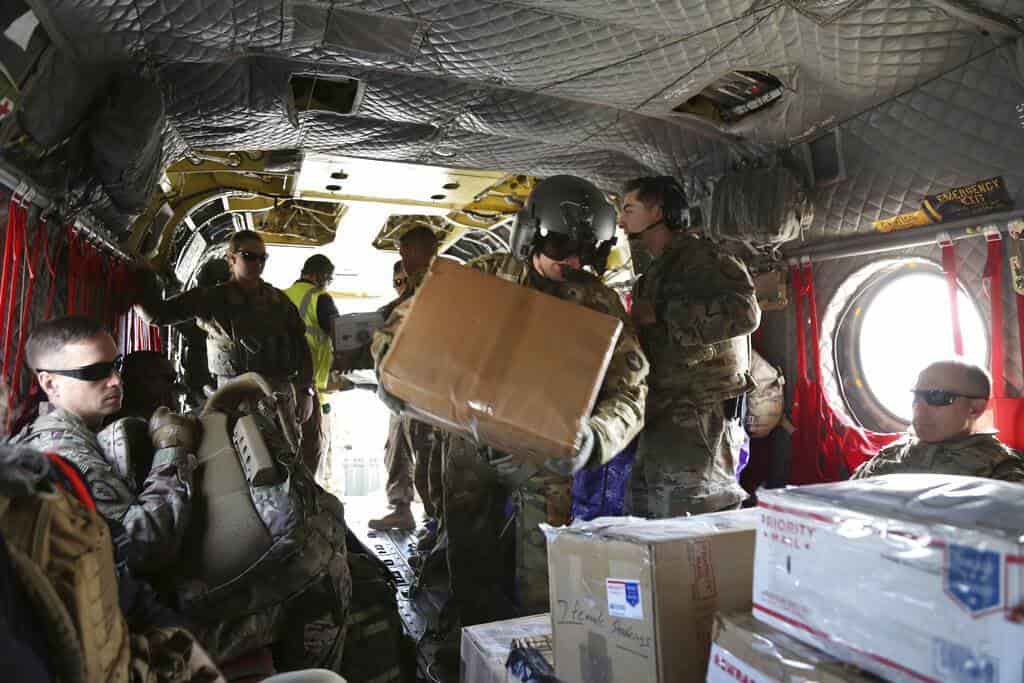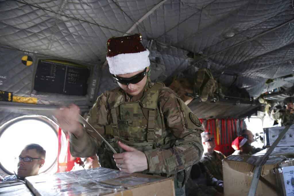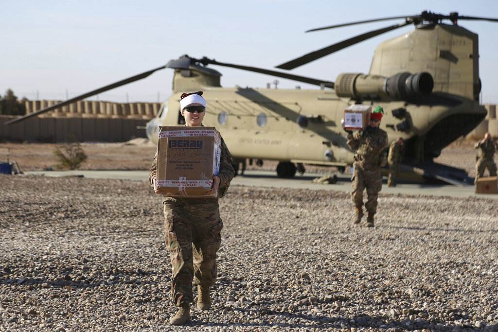 Este año, el trineo y los renos de Santa Claus al parecer se intercambiaron por un eficaz helicóptero CH-47 Chinook. Sin embargo, las fuerzas de coalición no dejaron de usar alegres gorros rojos mientras descargaban las cajas de regalos en cinco ubicaciones en el este de Siria, como lo presenció el lunes The Associated Press.