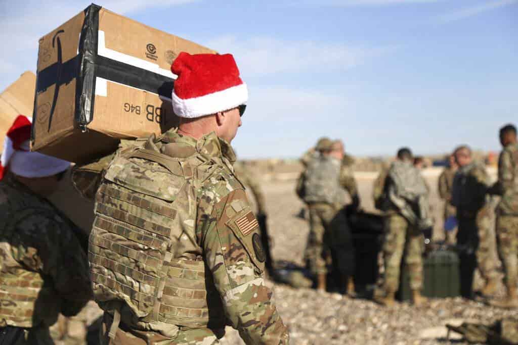 Además de los regalos, una banda militar de Estados Unidos llegó para tocar villancicos. Los soldados recibieron botas navideñas llenas de dulces, artículos de aseo personal y otros regalos. La mayoría fueron donados por organizaciones de apoyo militar en Estados Unidos, así como iglesias y organizaciones no lucrativas, dijo el coronel Myles Caggins, vocero de la coalición.