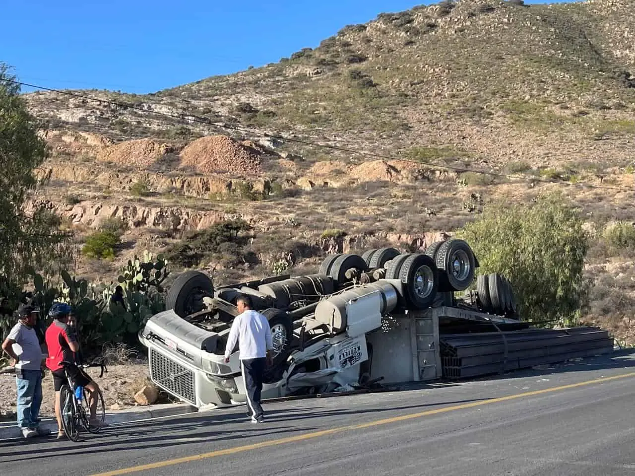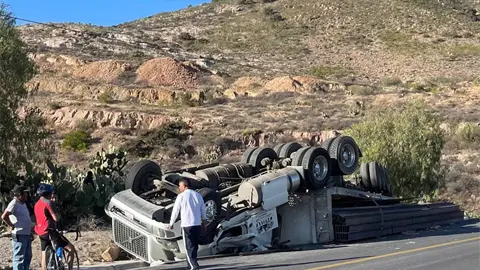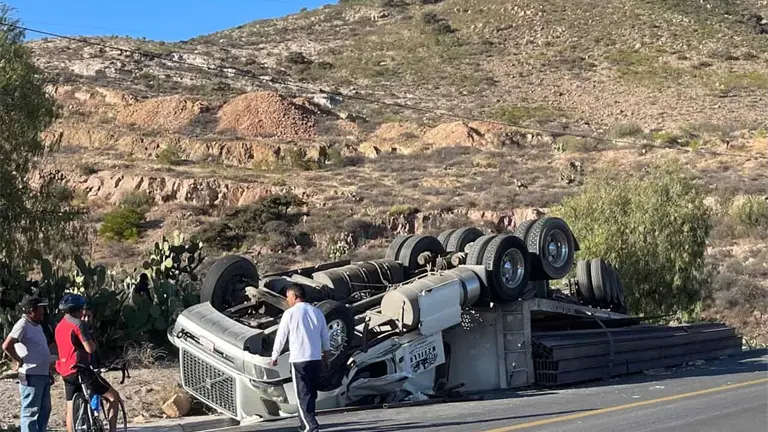 De acuerdo con la información disponible, el operador del tráiler —que transportaba vigas de acero— circulaba sobre dicha vía cuando, al salir de una curva, perdió el control hacia su lado derecho, lo que provocó que se saliera de la cinta asfáltica y terminara volcándose, quedando con las llantas hacia arriba.