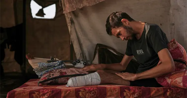 Yassin Marouf yace en una tienda de campaña en el centro de Gaza, con el pie izquierdo amputado y la pierna derecha apenas sujeta con varillas.