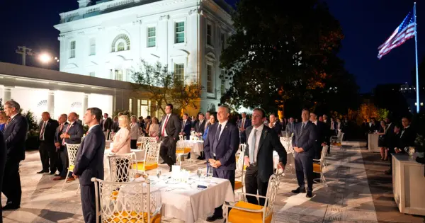La inauguración oficial del Club del Jardín de Rosas estaba destinada a ser con titanes tecnológicos como Mark Zuckerberg de Meta, Sundar Pichai de Google y Satya Nadella de Microsoft. Sin embargo, la lluvia obligó a Trump a trasladar el evento del 4 de septiembre al interior, al ornamentado Comedor de Estado.