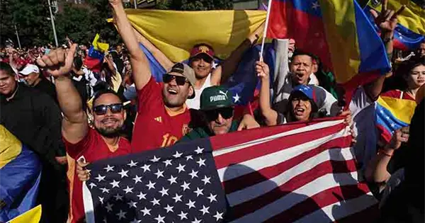 En Doral, Florida, hogar de la comunidad venezolana más grande de Estados Unidos, la gente se envolvía en banderas venezolanas, comía bocadillos fritos y celebraba mientras sonaba la música.