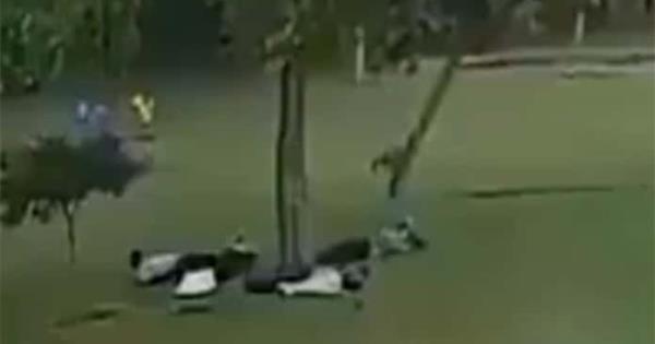 En el video se observa a tres jardineros y su supervisor debajo de un árbol mientras esperaban a que pasara la tormenta, pero tan sólo unos segundos después el rayó cayó provocando un destello rojizo y naranja.