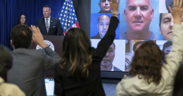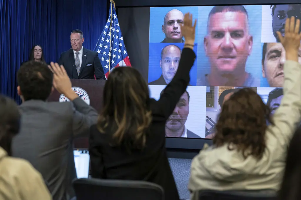 "Estos representan verdaderas amenazas a la seguridad nacional", dijo Lyons en una conferencia de prensa. Detrás de él había una exhibición de fotos de hombres que, según él, habían sido condenados por violación, homicidio, robo a mano armada y otros crímenes.