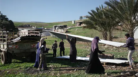 "Hemos estado sufriendo mucho por los colonos. Todos los días, vienen a pie, o en tractores, o a caballo con sus ovejas a nuestras casas. Entran a las casas de la gente diariamente", denunció Nayef Zayed, un residente, mientras los vecinos desmontaban corrales de ovejas y estructuras de hojalata.