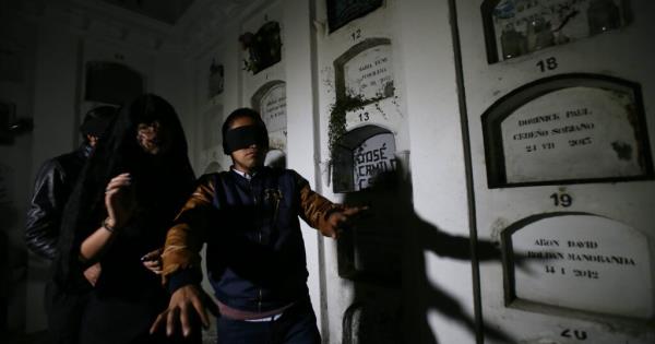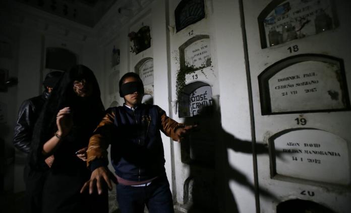 En su recorrido nocturno por el cementerio El Tejar de la capital ecuatoriana, creado a inicios del siglo XIX, van custodiados por una decena de personas que visten capuchas y largos hábitos negros que a intervalos los interpelan con frases como “¿Por qué pierdes el camino?”, “¿Adónde vas?, mientras dan golpes.