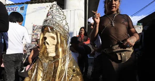 En el marco del 25 aniversario de la Congregación Nacional de la Santa Muerte, decenas de fieles se reunieron a las afueras de la estación del Metro Ecatepec para participar en una jornada de convivencia que incluyó danzas y alimentos compartidos