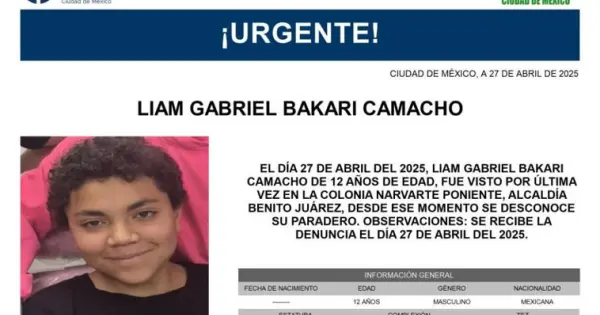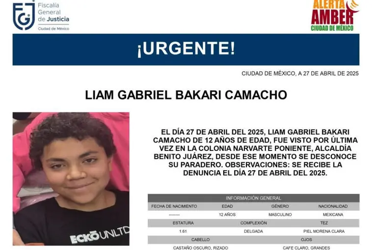La Fiscalía General de Justicia de la Ciudad de México (FGJ CDMX) activó la alerta AMBER con el fin de dar con el paradero de Liam Gabriel Bakari Camacho, un niño de 12 años.