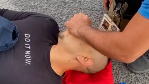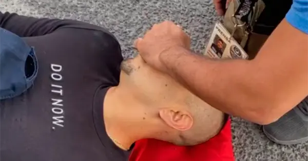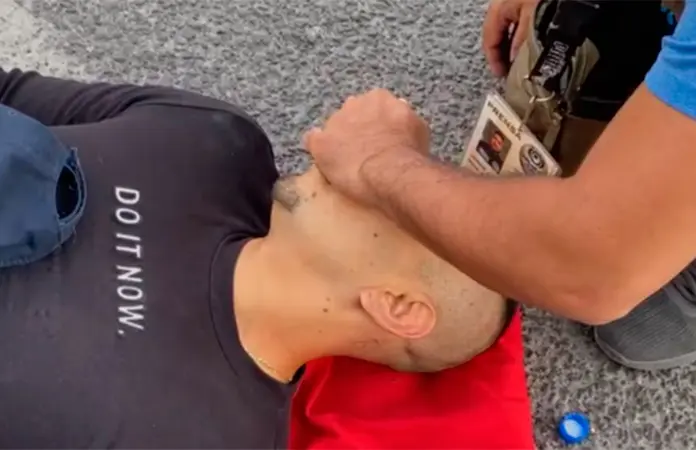 En la transmisión se observa a Makario con lesiones tirado en el piso a causa de las lesiones. Sus lentes quedaron destruidos en el asfalto.