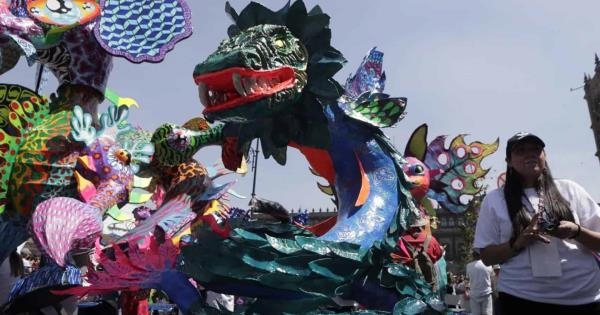 Fue sobre avenida 5 de mayo rumbo a Eje Central que se llevó a cabo la celebración y frente del desfile de encuentra el alebrije Cachalote Emplumado del artista Héctor José Carmona García.