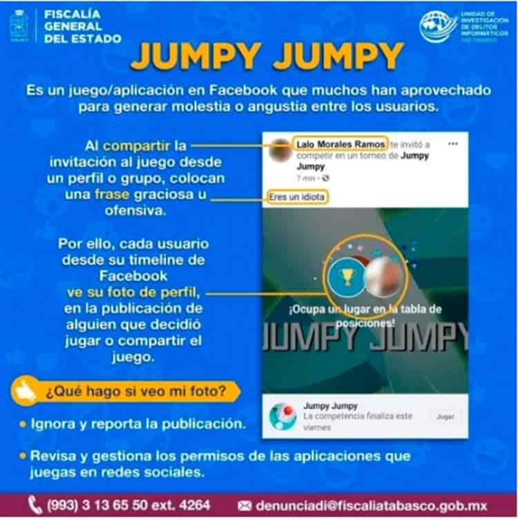 La Unidad de Investigación de Delitos Informáticos de la Fiscalía General del Estado de Tabasco alertó a los usuarios de redes sociales por el juego y aplicación "Jumpy Jumpy".