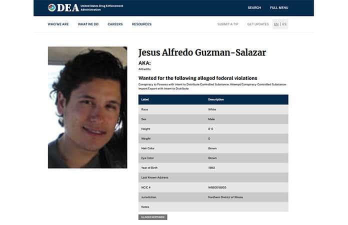 Se trata de Jesús Alfredo Guzmán Salazar, alias "Alfredillo", quien en septiembre de 2018 fue incluido en los diez criminales más buscados, entre los que se encuentran figuras importantes del narcotráfico en México como Rafael Caro Quinto; Ismael Zambada García, "El Mayo"; y el michoacano Nemesio Oseguera Cervantes, "El Mencho".