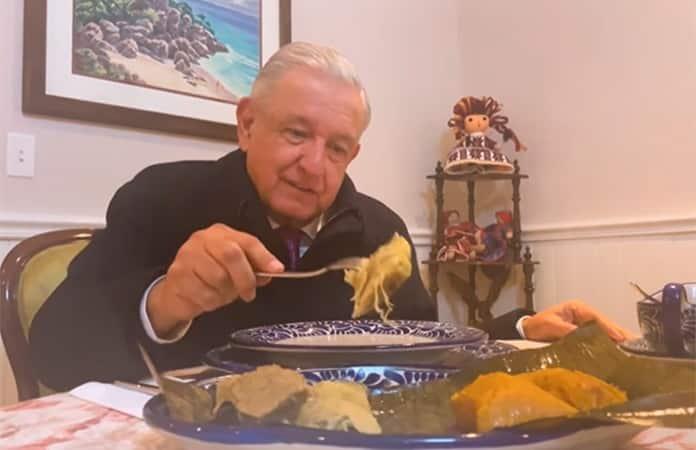 En el video, grabado por su esposa Beatriz Gutiérrez Müller en el departamento que habita en Palacio Nacional, se observa al Mandatario federal listo para desayunar tamales tabasqueños, como los chanchamitos y los hechos con chipilín.