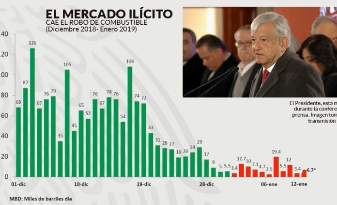 Dio detalles del robo de combustible en el país: En 2013, se robaban 38 mil barriles en el mes, y en promedio se robaban 16 diarios en los ductos y 22 en instalaciones de Pemex. En 2014 se robaban 24 barriles en promedio diarios en ductos y 22 en las instalaciones. Para 2015, se robaban en ductos 21 barriles y 28 en instalaciones. En 2016, se robaban 26 barriles diarios en ductos y cero en instalaciones. Para 2017, robaban 43 barriles diarios en promedio en ductos y 15 en instalaciones. En 2018, en promedio robaban 65 mil barriles al mes: 56 en ductos diarios y nueve en instalaciones.