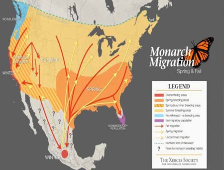 Las mariposas Monarca, hacen un largo viaje desde Canadá a los bosques de Michoacán y al estado de México. Ellas se orientan comparando la posición del Sol con la hora del día, que les indica un reloj biológico que tienen en una de sus antenas. Como insectos que son, no pueden controlar su calor; por eso deben que llegar a los bosques de Oyamel en las sierras de Michoacán, donde la temperatura es ideal para que no se congelen, ni se activen demasiado y gasten sus reservas de grasa que necesitaran para regresar al norte al final del invierno. En su ruta migratoria, cada otoño las mariposas Monarca atraviesan San Luis Potosí y se les puede ver volando cerca del suelo, viajando siempre en dirección sur oeste.