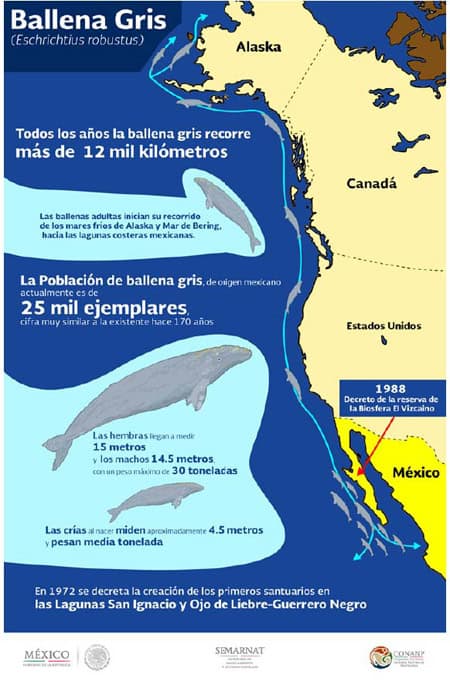 En el Pacifico norte, las enormes ballenas azules, cantarinas ballenas jorobadas, y las ballenas grises que se alimentan de pequeños crustáceos, larvas de cangrejos y camarones. Migran siguiendo el litoral hasta las tranquilas y relativamente tibias lagunas en la costa de Baja California para dar a luz. Julio Verne, el famoso autor, en su novela: "Las aventuras de Jean-Marie de Cabidoulin" menciona las terribles cacerías de ballenas, madres y ballenatos, que se hacían impunemente a principios del siglo pasado en las bahías y lagunas del Pacífico mexicano.