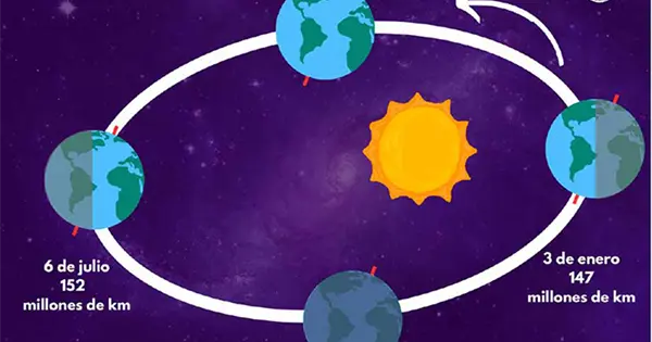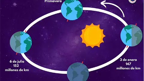 La órbita de la Tierra alrededor del Sol, no es circular, es una elipse y la distancia al Sol varia a lo largo del año. Esto no influye, como a veces erróneamente se piensa, en las estaciones, que se producen por la inclinación del eje terrestre. En un momento del año, el Sol ilumina más la mitad de arriba del plantea y en otro momento ilumina más la de abajo.